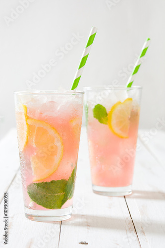 Fresh watermelon mojito on white wood