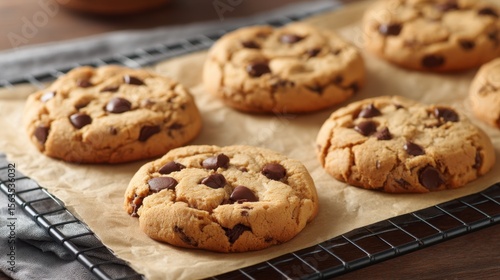 Freshly baked chocolate chip cookies cooling on a wire rack
