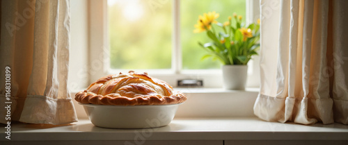 Freshly baked pie cooling on window sill in quaint cottage, Pi Day