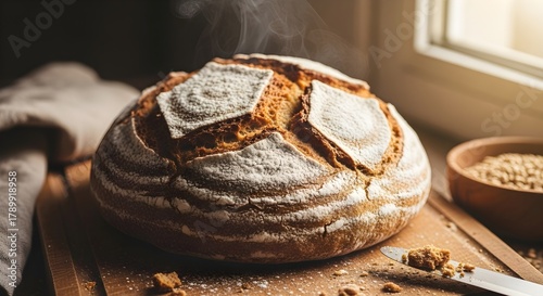 Freshly Baked Sourdough Bread Loaf with Flour Dusting on Wooden Board - Artisan Baking, Healthy Food, Rustic Kitchen Still Life