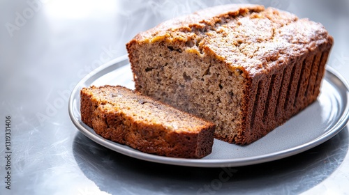 Freshly baked steaming loaf of banana bread sliced and served on a plate ready for enjoyment and tasting delights