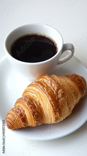 Freshly brewed black coffee served in a white ceramic cup alongside a golden flaky croissant on a white saucer isolated against a plain white background