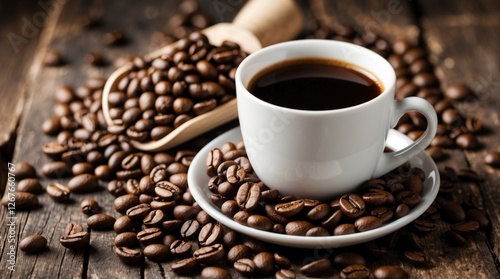 Freshly brewed coffee in a white cup surrounded by roasted coffee beans on a rustic wooden surface, evoking a cozy atmosphere.