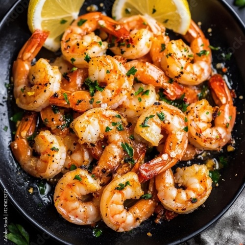 Freshly cooked shrimp garnished with herbs and lemon on a dark plate during a casual dining experience. Generative AI