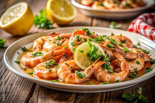 Freshly cooked shrimp scampi dish garnished with parsley and lemon, served sizzling hot on a white plate, surrounded by blurred background of kitchen ambiance.