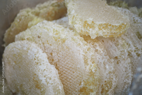 Freshly harvested honeycomb showcased at a local market