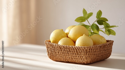 Freshly harvested lemons arranged in a woven basket on a light-colored surface near a sunlit window.