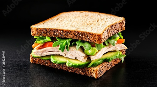 Freshly made sandwich with turkey, lettuce, tomato, and cucumber on whole grain bread