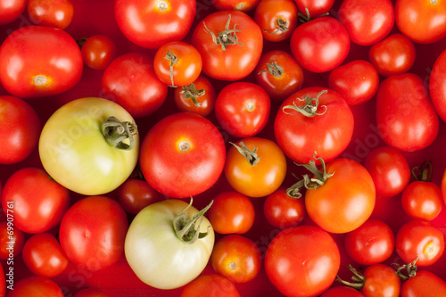 freshly picked red tomatoes in a box plus two green