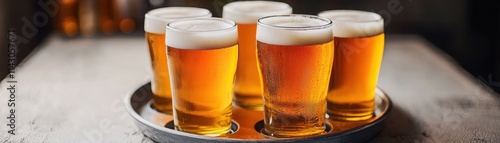 Freshly poured craft beers served on a wooden table, showcasing rich amber hues and frothy heads in a cozy pub environment.