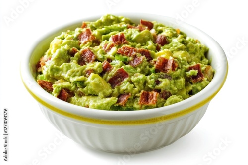 Freshly prepared bowl of creamy guacamole topped with crispy bacon, ideal for appetizers or snacks