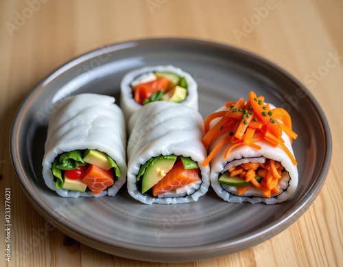 Freshly prepared sushi rolls with colorful vegetables and fish served on a gray plate