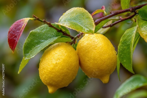 Freshly ripened lemons hanging from a branch after rain in a backyard garden
