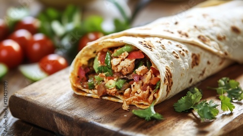 Freshly Rolled Burrito Filled with Meat Vegetables and Cilantro on Wooden Board : Generative AI