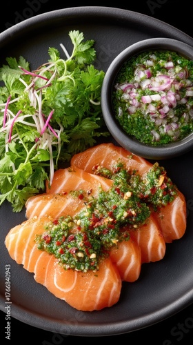 Freshly Sliced Salmon Sashimi Garnished with Green Sauce and Fresh Herbs Served on a Dark Plate with Cilantro Salad and a Small Bowl of Dipping Sauce