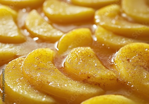 Freshly Sliced Yellow Apples Glazed in Sweet Cinnamon Sauce for Dessert or Culinary Decoration in a Bright and Appealing Presentation