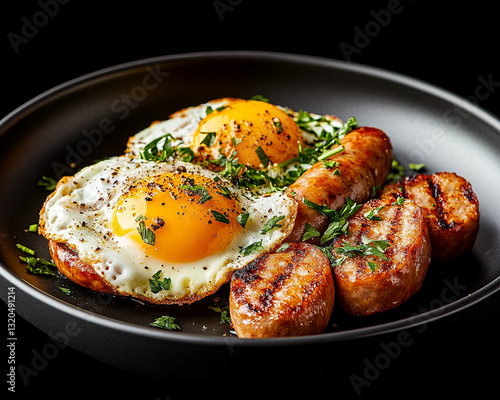 Fried Eggs with Grilled Sausages and Fresh Herbs on Black Plate