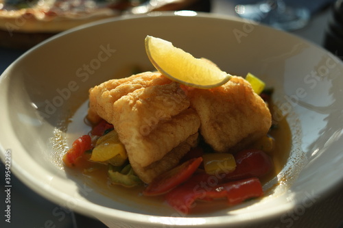 Fried fish fillets and vegetables. Delicious fish dish in plate. Food concept.