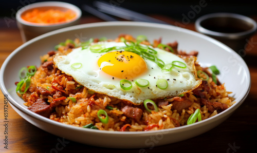 Fried rice topped with fried eggs.