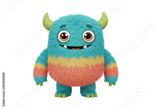 Friendly Cartoon Monster: Teal, Pink, and Yellow Furry Creature Illustration isolated on transparent background