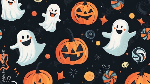 Friendly Halloween pattern with smiling pumpkins, cute ghosts, and candy on a dark background