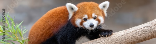 Friendly Red Panda Climbing on Branch in Natural Habitat with Lush Greenery and Soft Focus Background