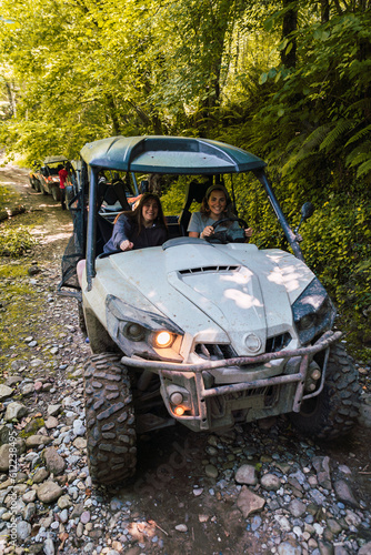 Friends driving buggy and spending vacation at forest