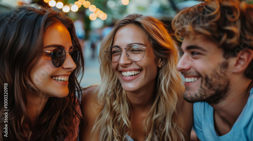 Friends enjoying a joyful evening outdoors in a city, smiling and laughing together under warm street lights