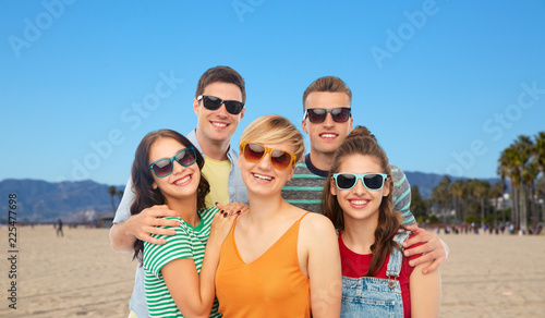 friendship, summer and people concept - group of happy smiling friends in sunglasses hugging over venice beach background in california