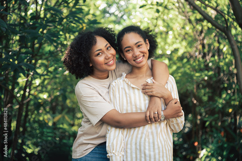 Friendship two young beautiful smiling girls and hugging in the garden