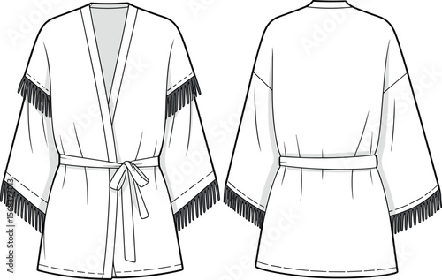 Fringe kimono vector, belted cardigan sketch, fashion flat drawing, women’s robe jacket, open front outerwear, loose sleeve design, boho clothing illustration