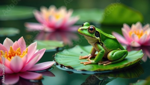 Frog sitting on a leaf surrounded by water lilies, greenery, aquatic life