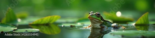 Frog taking a leisurely swim in a pool of water with lily pads, leisure, lily pads, aquatic