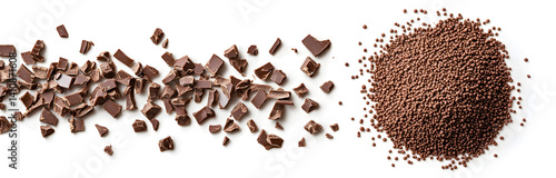 From a top perspective, chocolate sprinkles for cake and pastry toppings are isolated on white, highlighting their texture and appearance