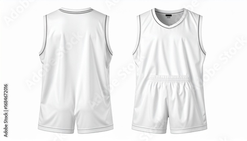 Front and back views of a generic white basketball uniform on a white background, A matching basketball set for a team in need of a design template