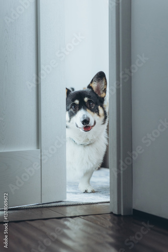 Front door of a house with a cute corgi dog inside. Pets in the house, welcome