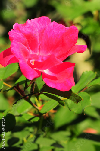 front view, closeup of, a single, pink flowers, in full bloom, under mid-afternoon, sunlight, in Philadelphia, Pennsylvania