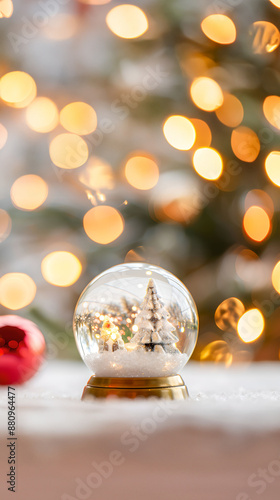 front view, closeup vertical image, Christmas globe with christmas decoration. Blurred background, copy space for text. For banner, design, new year, shop, linkedin, commercial, presentation