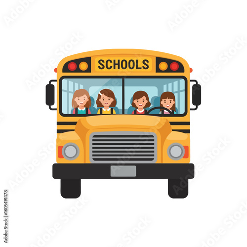 Front view of a yellow school bus with four young girls visible inside, one driving, against a white background.