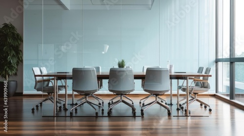 Front view of empty modern conference room with office table and chairs in glass room