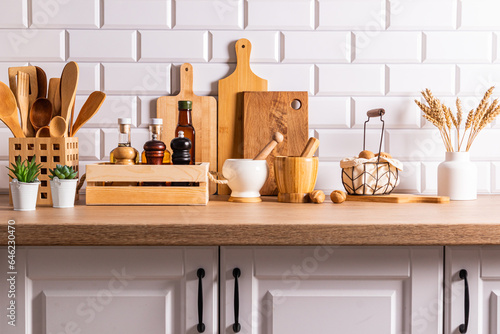 Front view of kitchen wooden countertop with a set of various kitchen utensils and eco-friendly items. A zero-waste house.