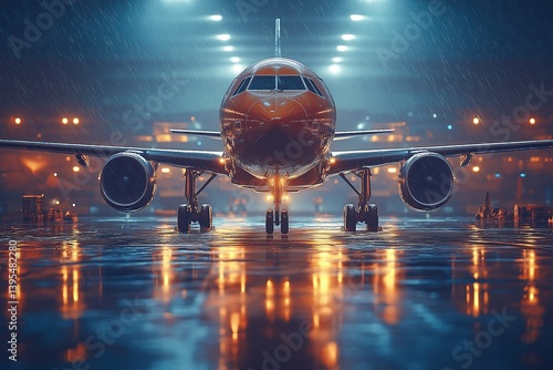 Front View of Passenger Jet on Wet Runway at Night