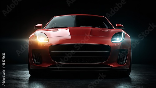 Front View of Red Car with Headlights On in Dark Room, Isolated on Black Background