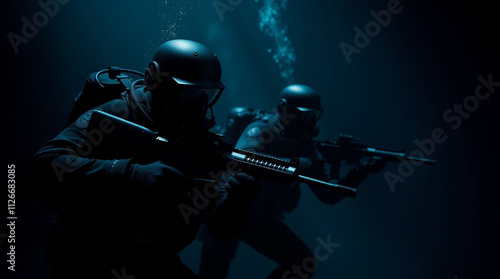 Front view of three special forces in black wet suits and Helmets Diving with Firearms underwater.