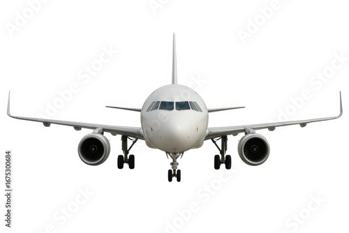Frontal Plane Airplane: A detailed front view of a modern passenger plane, emphasizing its clean lines and aerodynamic design, set against a vibrant setting.