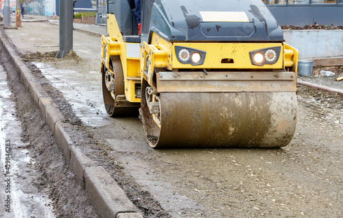 Frontal view of a road roller rolling the base of the sidewalk along a concrete curb near the carriageway.