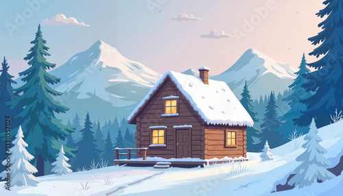 Frostbitten mountain cabin glowing warmly in snowy landscape, winter solace
