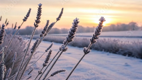Frosted Prairie. Frosted prairie at dawn showcasing serene winter flowers in lavender hues. Frozen flowers plants.