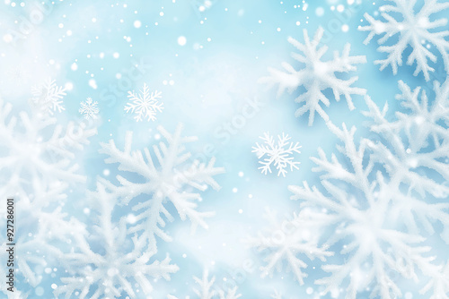 Frosted white snowflakes delicately placed on a cool blue background, capturing the essence of winter with a serene and tranquil atmosphere. Copy space available for seasonal messages.