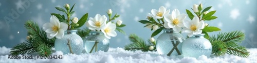 Frosty glass vases filled with evergreen branches and white flowers, white flowers, holiday decor, snowy